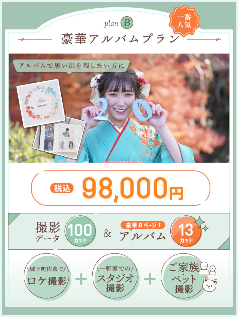 | 前撮りをされたお客様 前撮り&成人式当日レンタル特別価格 2回着用 | 98000円税別~ |